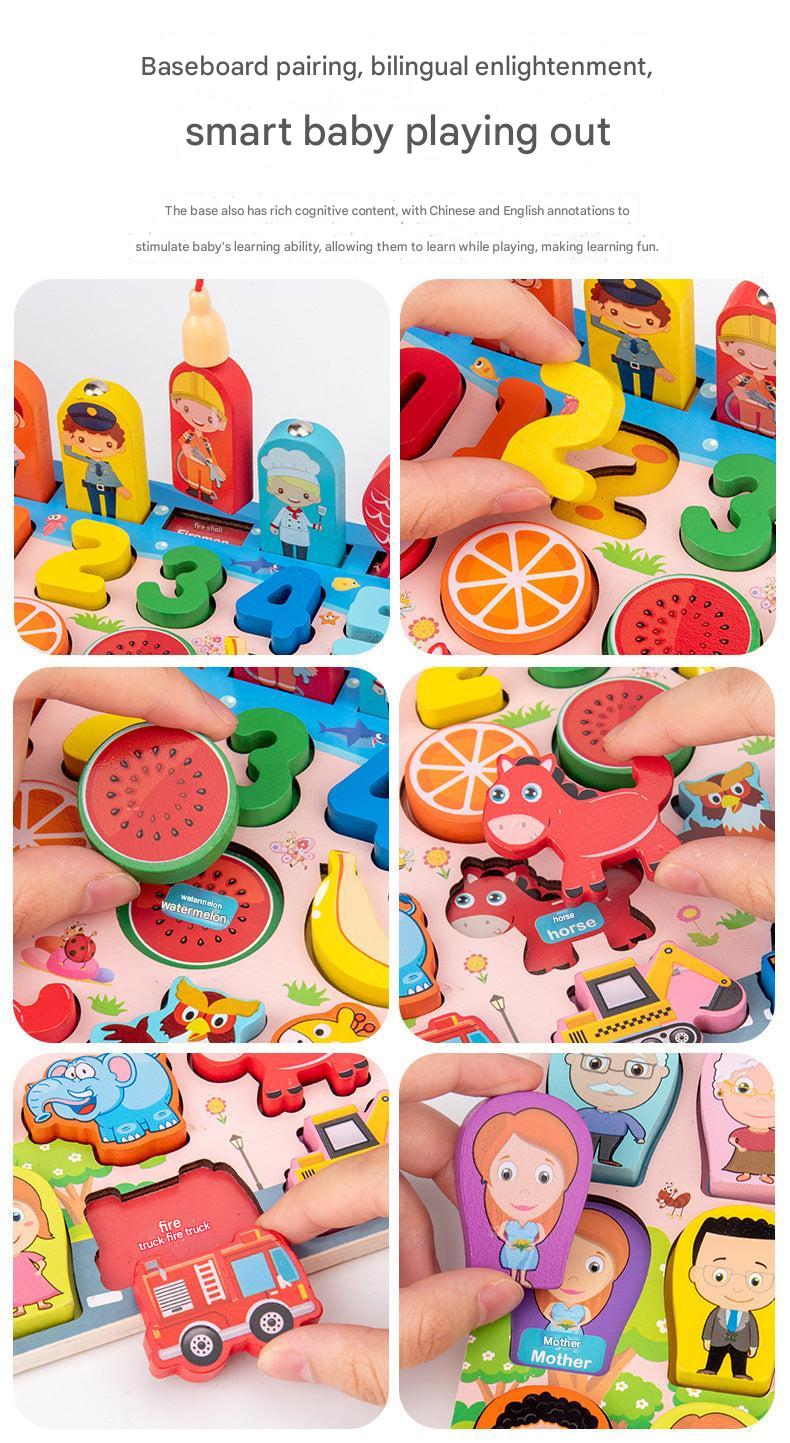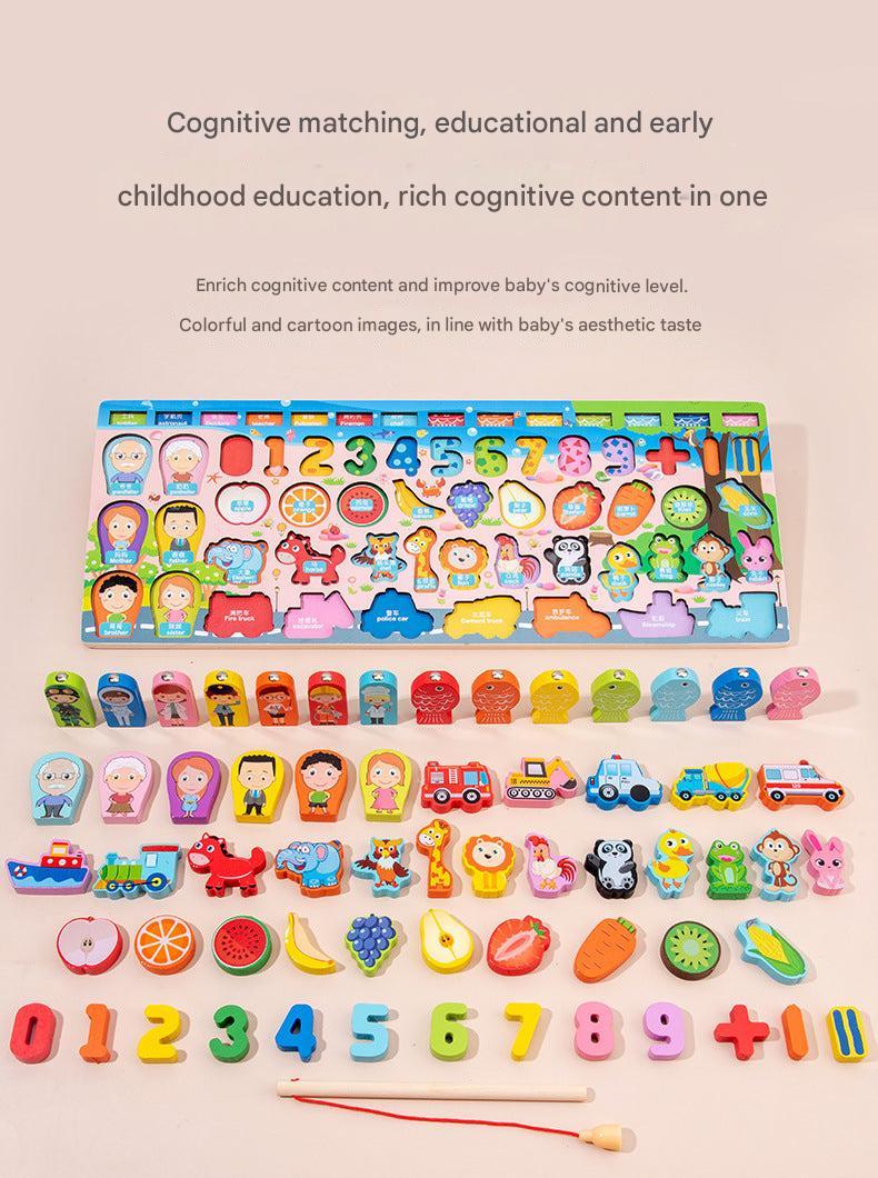Introduce your child to the excitement of learning with our 7-in-1 Magnetic Fishing and Math Puzzle Board. This multi-functional early learning toy features a magnetic fishing game that captivates children as they 'catch' numbers and shapes, making education both fun and interactive. Each colorful wooden piece is designed to fit perfectly into the corresponding slot on the board, promoting cognitive development and hand-eye coordination. Safe for children aged 0-3 years and crafted from durable, child-safe materials, this toy ensures hours of educational play. Perfect for preschool learning, it encourages critical thinking, problem-solving, and improves concentration.