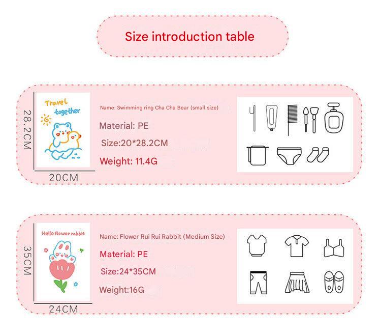 Discover the ultimate solution for packing efficiency and style with our Adorable Animated Travel Organizer Bags. Made from superior EVA material, these bags are both durable and lightweight, making them perfect for both short and long trips. Featuring a variety of lovely cartoon designs, these organizers add a touch of whimsy while keeping your belongings neatly sorted. Whether it's for underwear, magazines, cosmetics, or stationery, each bag provides ample space and protection. With several size options and pack choices that include handy labeling tags, organizing your luggage has never been easier or more delightful. Ideal for all travelers looking to add efficiency and fun to their packing routine!