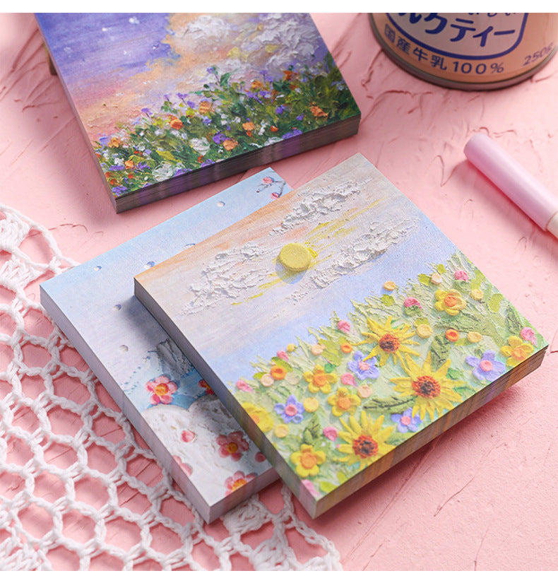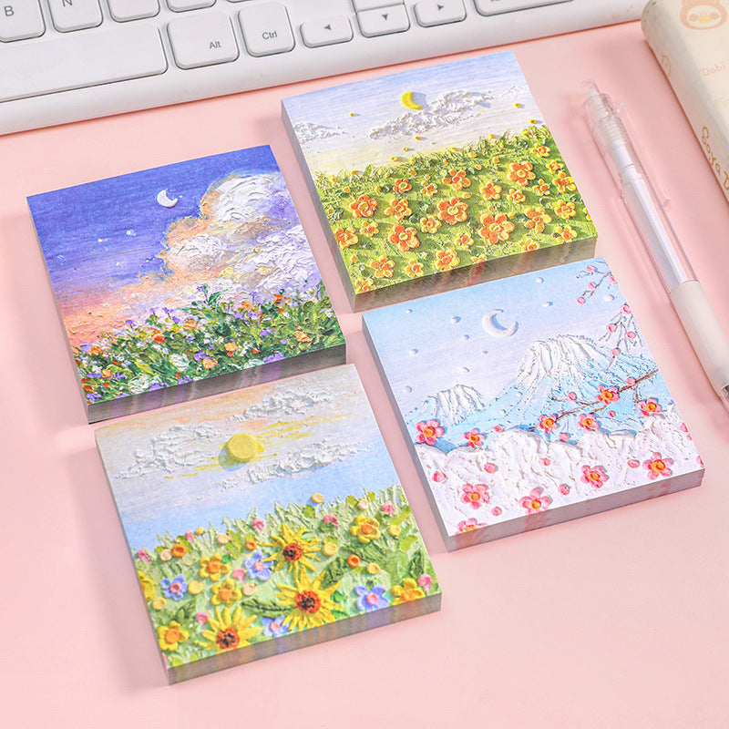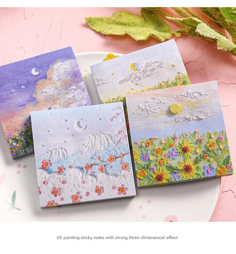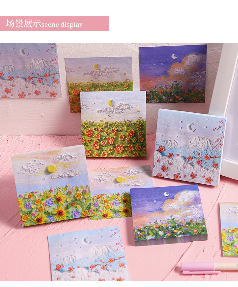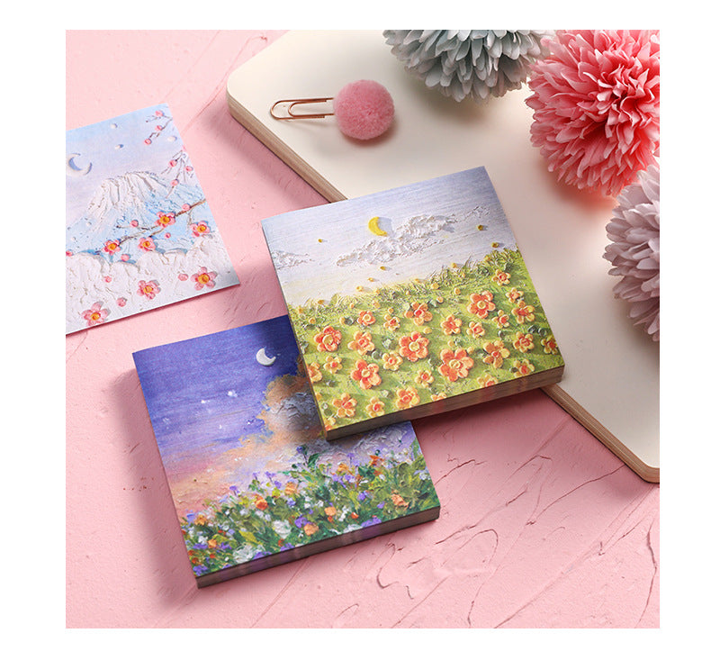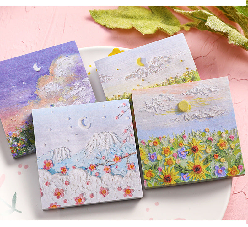 Enhance your note-taking experience with our Artistic Sticky Notes. Designed to inspire and organize, these memo pads feature captivating oil painting designs from views beneath Mount Fuji to intense rose sniffs. Each pad contains 50 sheets, made of high-quality, eco-friendly paper suitable for all pens and pencils. With their reliable adhesive, you can place your notes where they are most visible without worrying about any residue. Take these stylish and functional sticky notes with you wherever you go, whether it's at school or in the boardroom. Perfect for teachers, students, professionals, and anyone who appreciates a touch of art in their daily tasks.