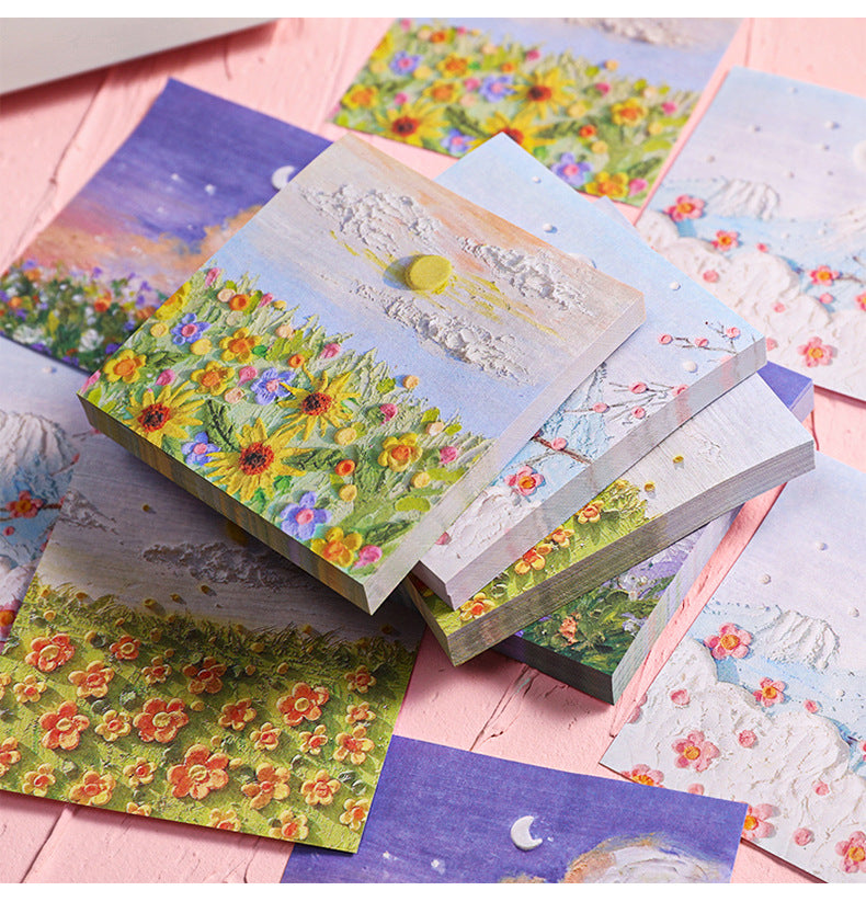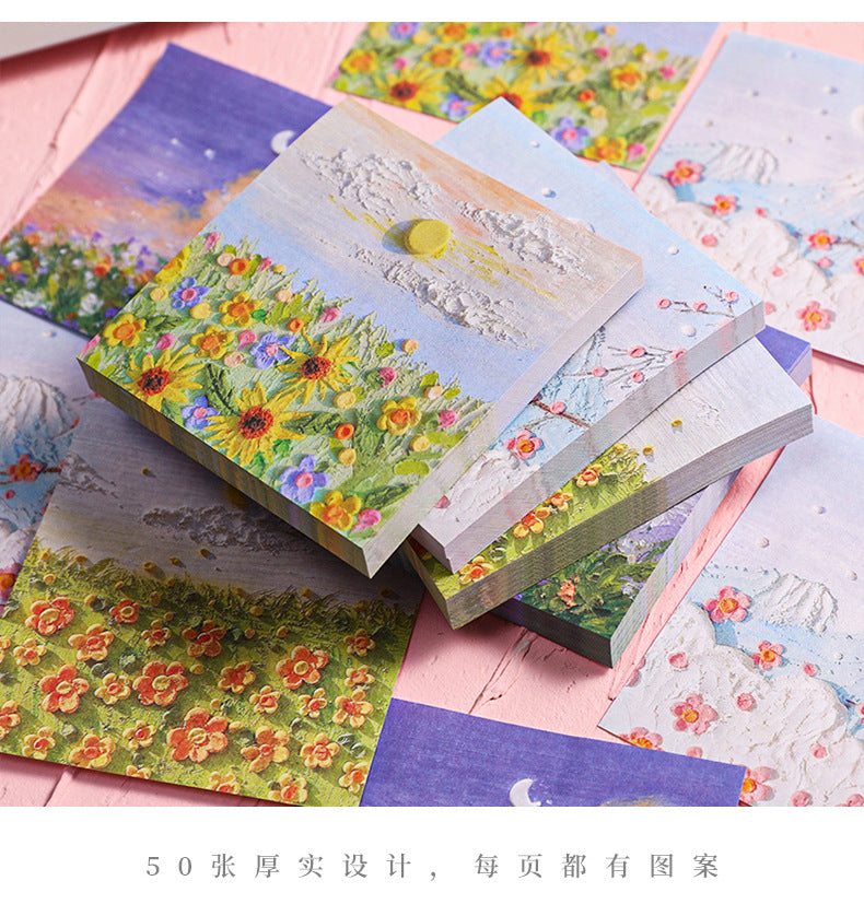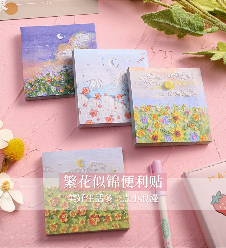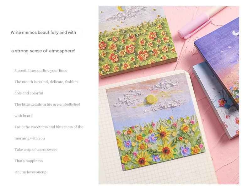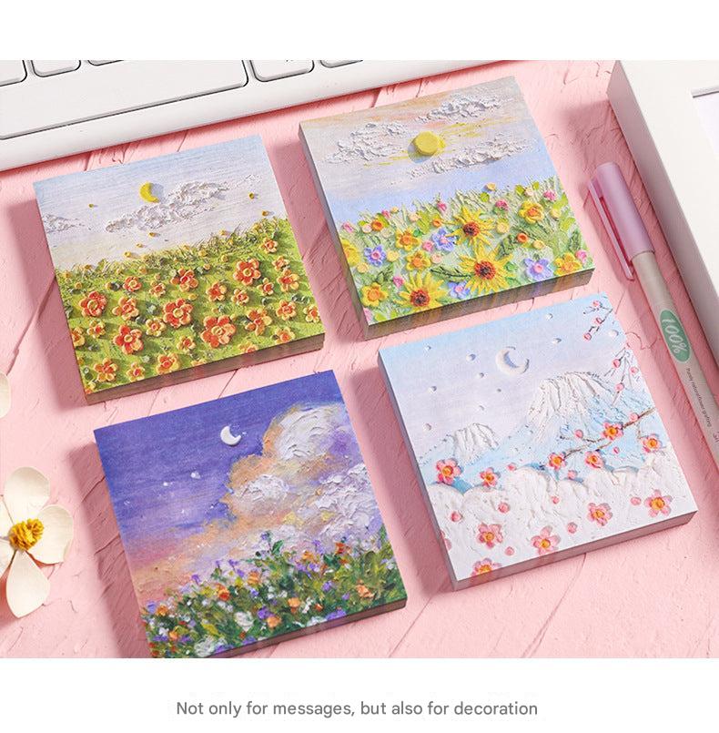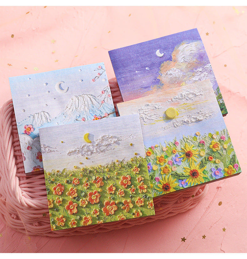 Enhance your note-taking experience with our Artistic Sticky Notes. Designed to inspire and organize, these memo pads feature captivating oil painting designs from views beneath Mount Fuji to intense rose sniffs. Each pad contains 50 sheets, made of high-quality, eco-friendly paper suitable for all pens and pencils. With their reliable adhesive, you can place your notes where they are most visible without worrying about any residue. Take these stylish and functional sticky notes with you wherever you go, whether it's at school or in the boardroom. Perfect for teachers, students, professionals, and anyone who appreciates a touch of art in their daily tasks.