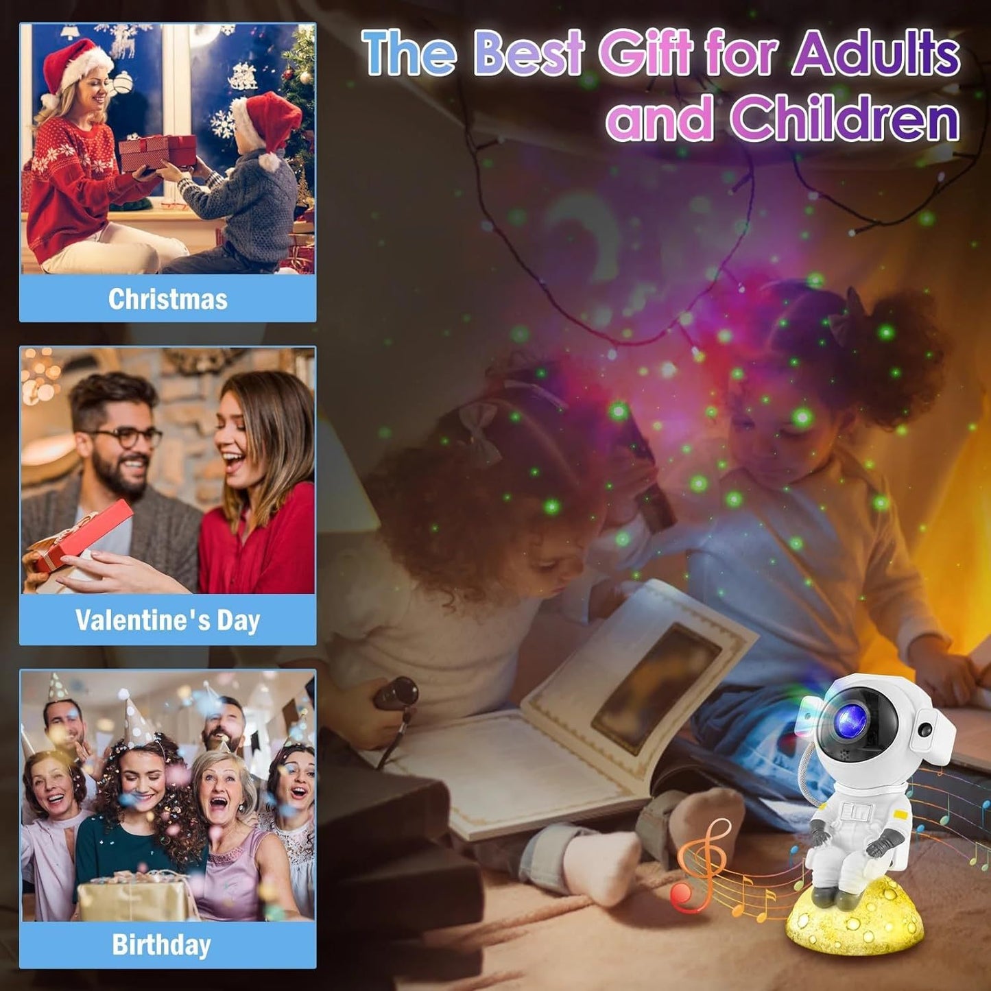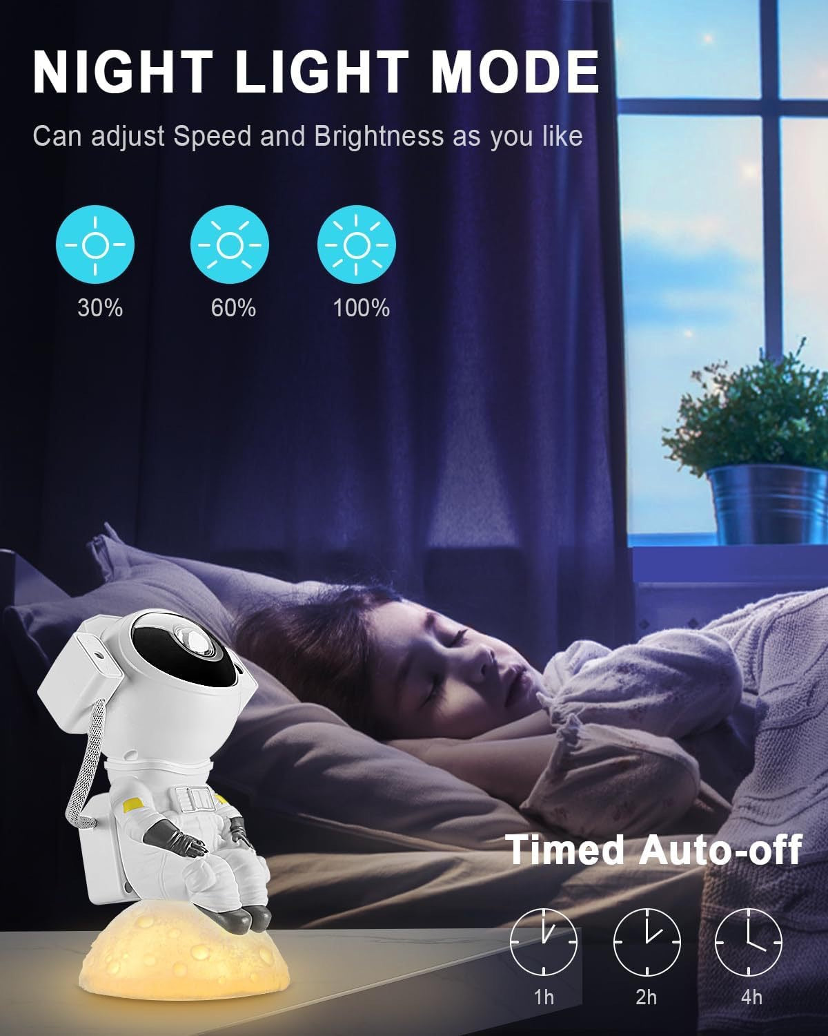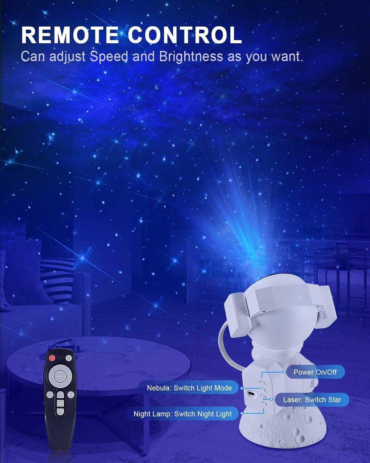 • Space-Saving Design: Compact astronaut themed projector fits seamlessly into any decorating style.