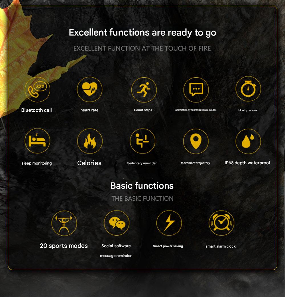 Functions Call, Heart Rate Monitoring, Sleep Tracking, Notifications, Step Tracking