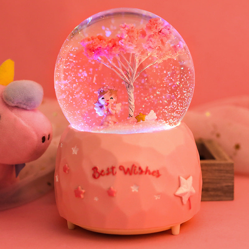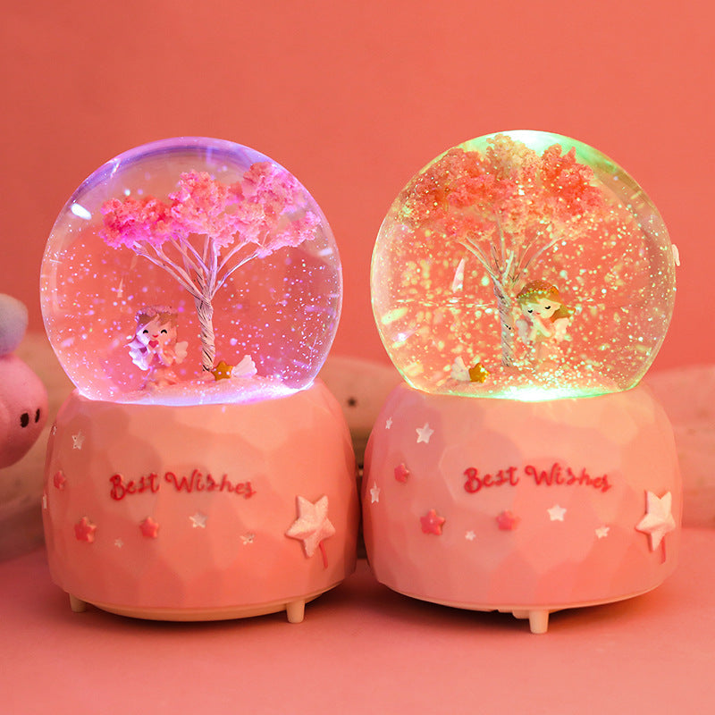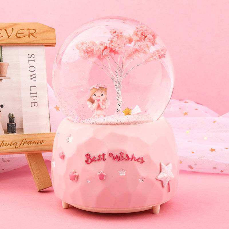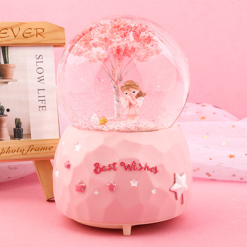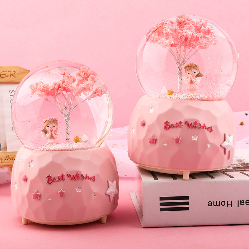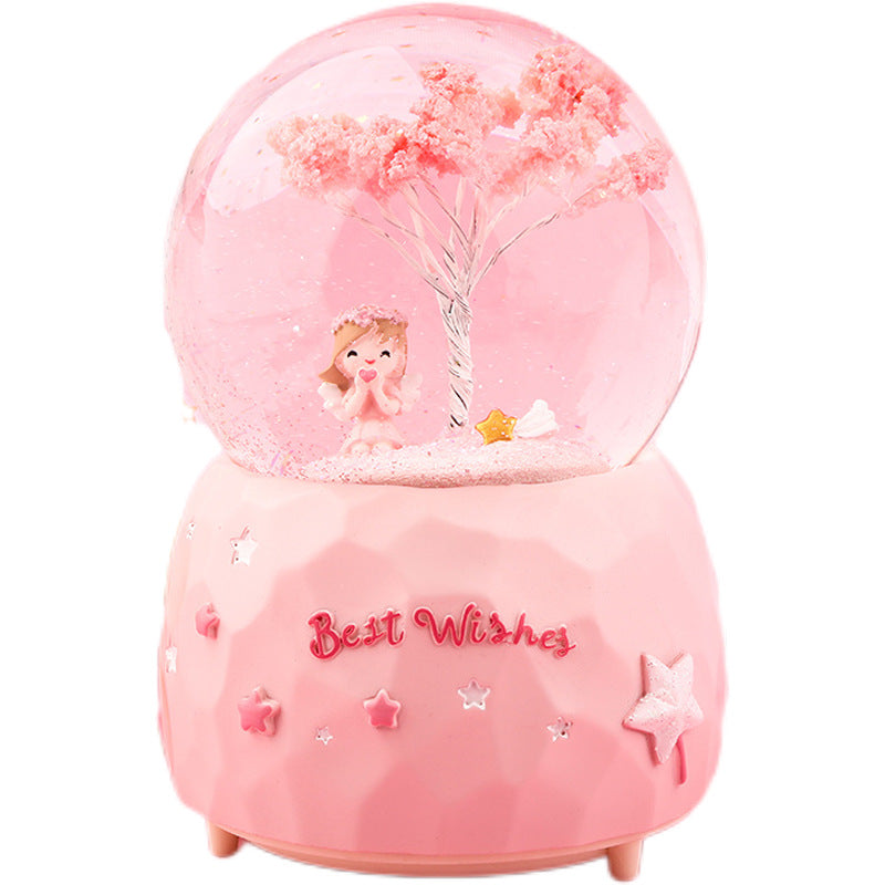 • Romantic Cherry Blossom Theme: Features a delightful cherry blossom angel inside a crystal-clear globe, bringing a touch of serenity and romance.