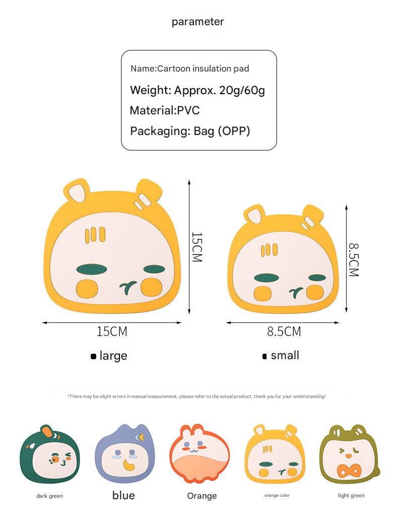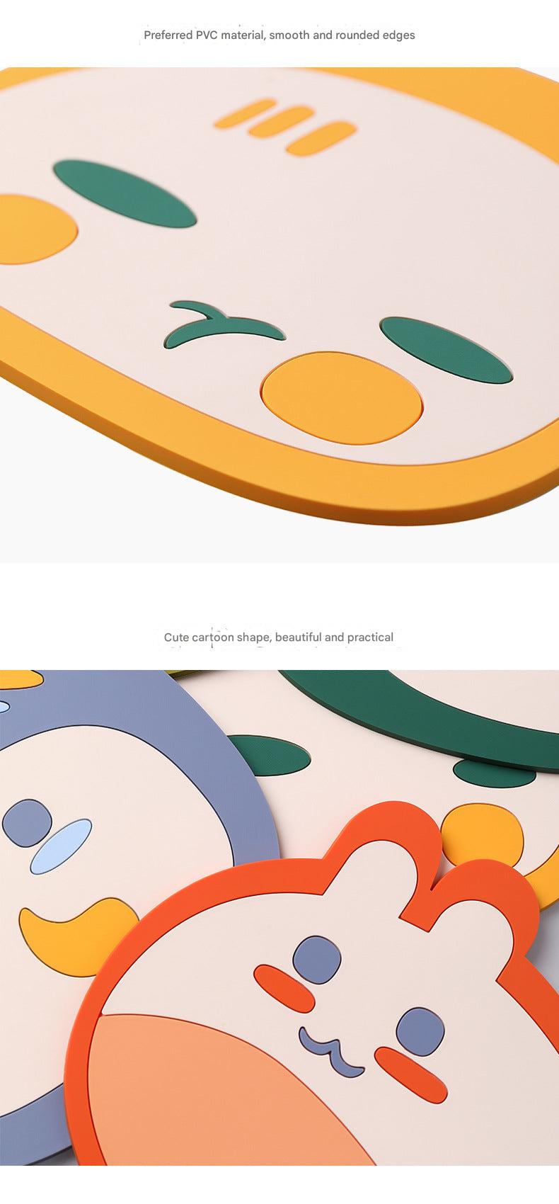 Introducing our Colorful Cartoon Table Mats, designed to keep your dining surface safe and stylish. Made from high-quality PVC, these mats are heat-resistant, ensuring your table stays protected from hot dishes. Their non-slip feature guarantees stability during meals, while the waterproof and oil-proof materials facilitate easy cleaning, so you can enjoy your meals without worrying about spills. Available in fun cartoon designs, the mats resonate with children's preferences, making mealtime enjoyable. The mats come in various colors and shapes that cater to different kitchen aesthetics. Ideal for everyday use, these mats are not just practical but also enhance your home’s decor. Perfect for family dining or kids' snacks, they elevate every meal experience.