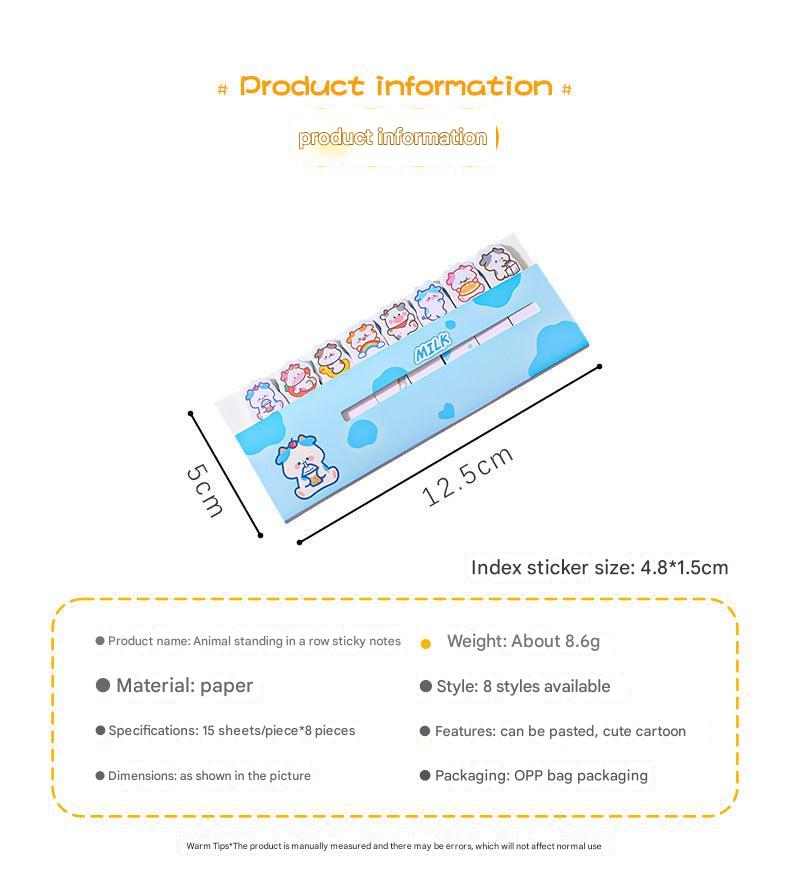 Enhance your organizing and memo-taking experience with our Cute Animal Cartoon Sticky Notes. Available in an array of delightful and playful animal designs, including Strawberry Bunny, Milk Tea Cow, and more. These stickies are not just a tool but a fun addition to your stationery collection, perfect for students, artists, or anyone who enjoys adding a personal touch to their daily tasks. Easily reposition your notes for perfect placement with residue-free adhesive. Each pack contains 15 pages of stickies, easily fitting into any study space or workstation. Get ready to transform your note-taking into an enjoyable activity with these charming sticky notes.