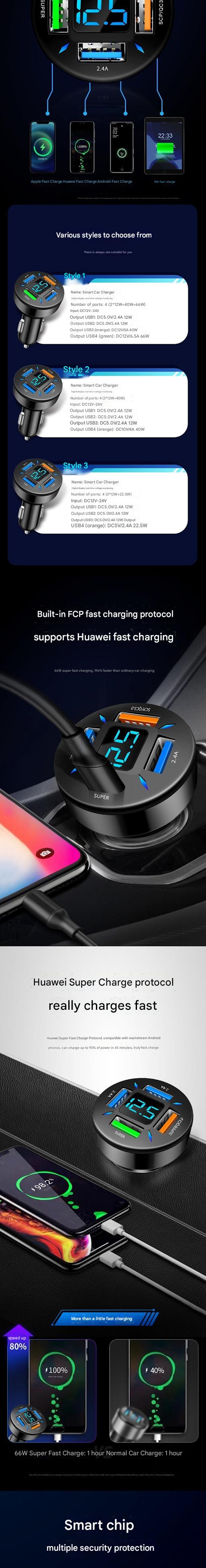 High-Speed 4-Port USB Car Charger with Digital Display, 66W Power Delivery, QC3.0 Technology