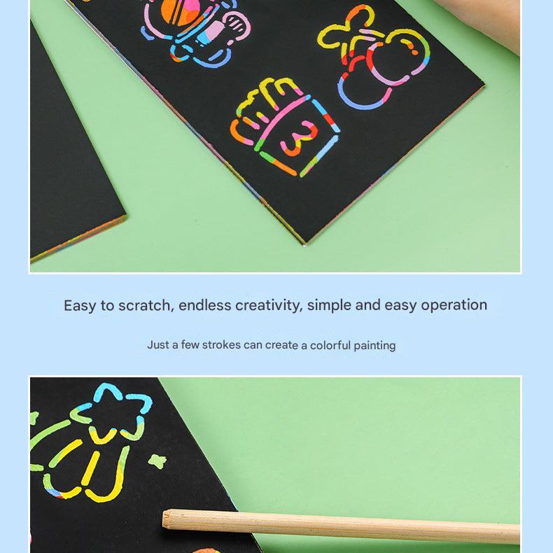 Unleash your child's creativity with our Kids Color Blast DIY Scratch Art Set. This artistic set captivates young minds, offering them a platform to scratch off the black matte surface of our specialty coated papers to reveal stunning rainbow colors underneath. With an array of vibrant scratch papers and easy-to-handle stylus pens, children can dive into an artistic world filled with unlimited design possibilities. The user-friendly and safe design makes this kit an excellent choice for enhancing fine motor skills and artistic insights. Whether preparing for a school project, a birthday party, or a fun weekend, this set promises hours of artistic enjoyment and a splendid way to engage with peers and develop social skills.