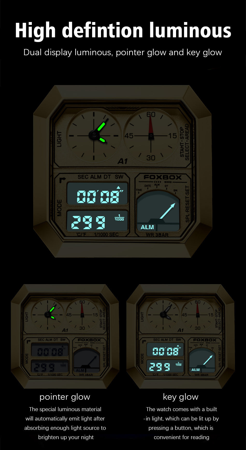 digital analog sports watch night light feature