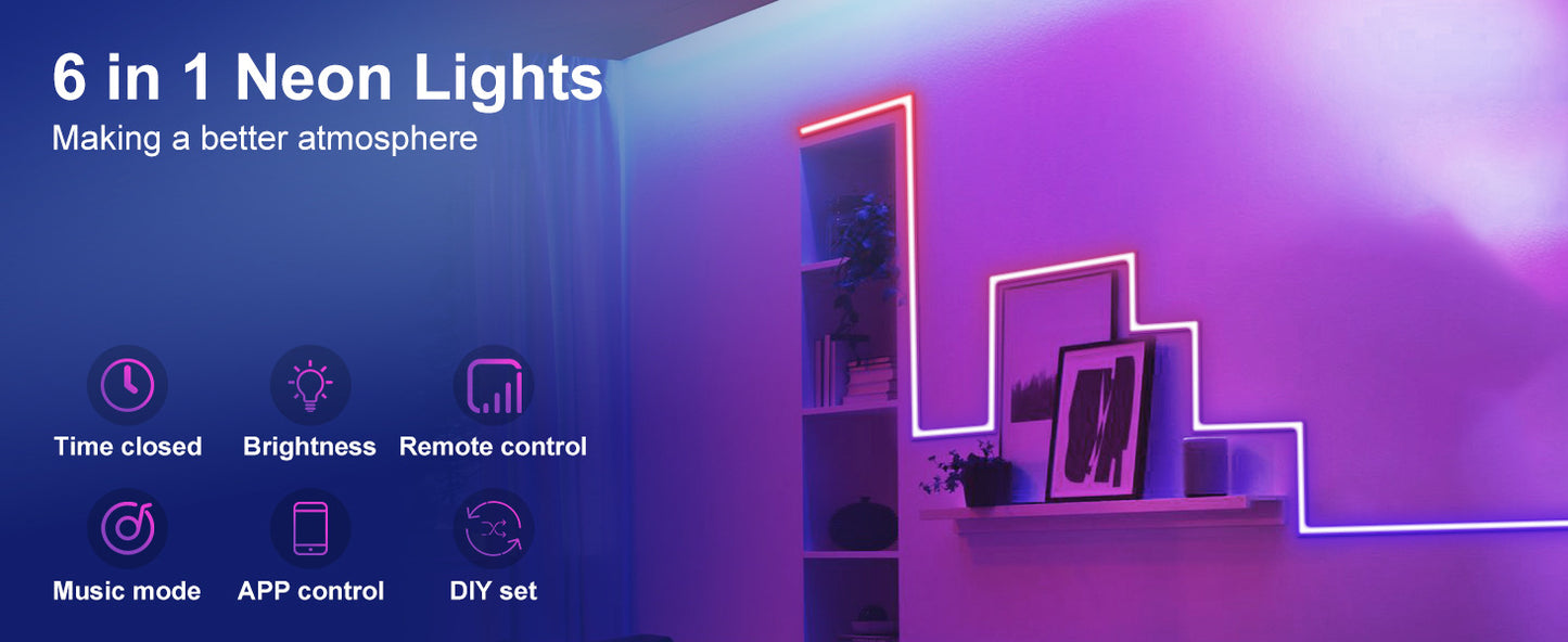Elevate the ambiance of any indoor environment with our Smart LED Neon Light Strip, tailored to bring both functionality and aesthetic allure into your space. Powered by advanced RGBIC technology, this light strip allows you to adjust the colors and effects, offering a spectrum of visually striking lightscapes suited for different moods and occasions. Control is flexible and straightforward, utilizing both Bluetooth and WiFi connectivity that links directly to your smartphone for on-the-go adjustments. The flexible design ensures a hassle-free installation process that complements any indoor architecture effortlessly. Enhanced with low-voltage safety and energy-efficient LED bulbs, it serves not only as a dynamic decoration but also as a cost-effective lighting solution. Whether it's setting up for a celebration or crafting the perfect relaxed atmosphere, this LED Neon Light Strip promises a blend of durability, versatility, and stunning visuals.