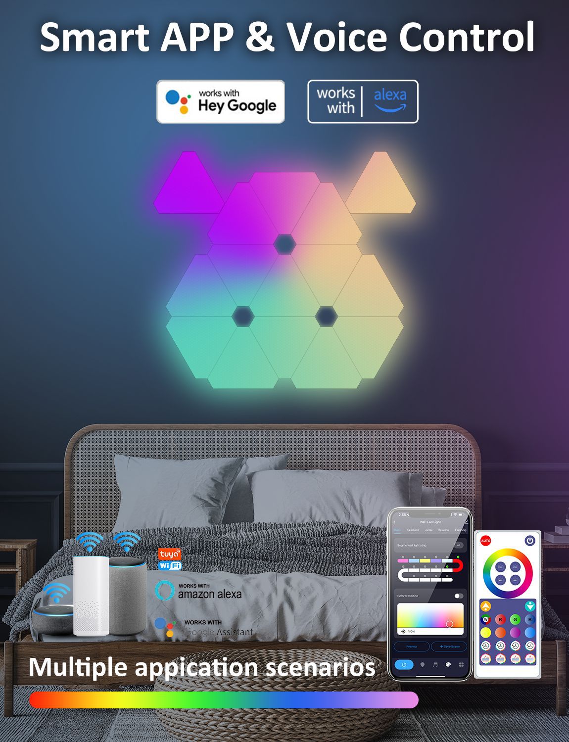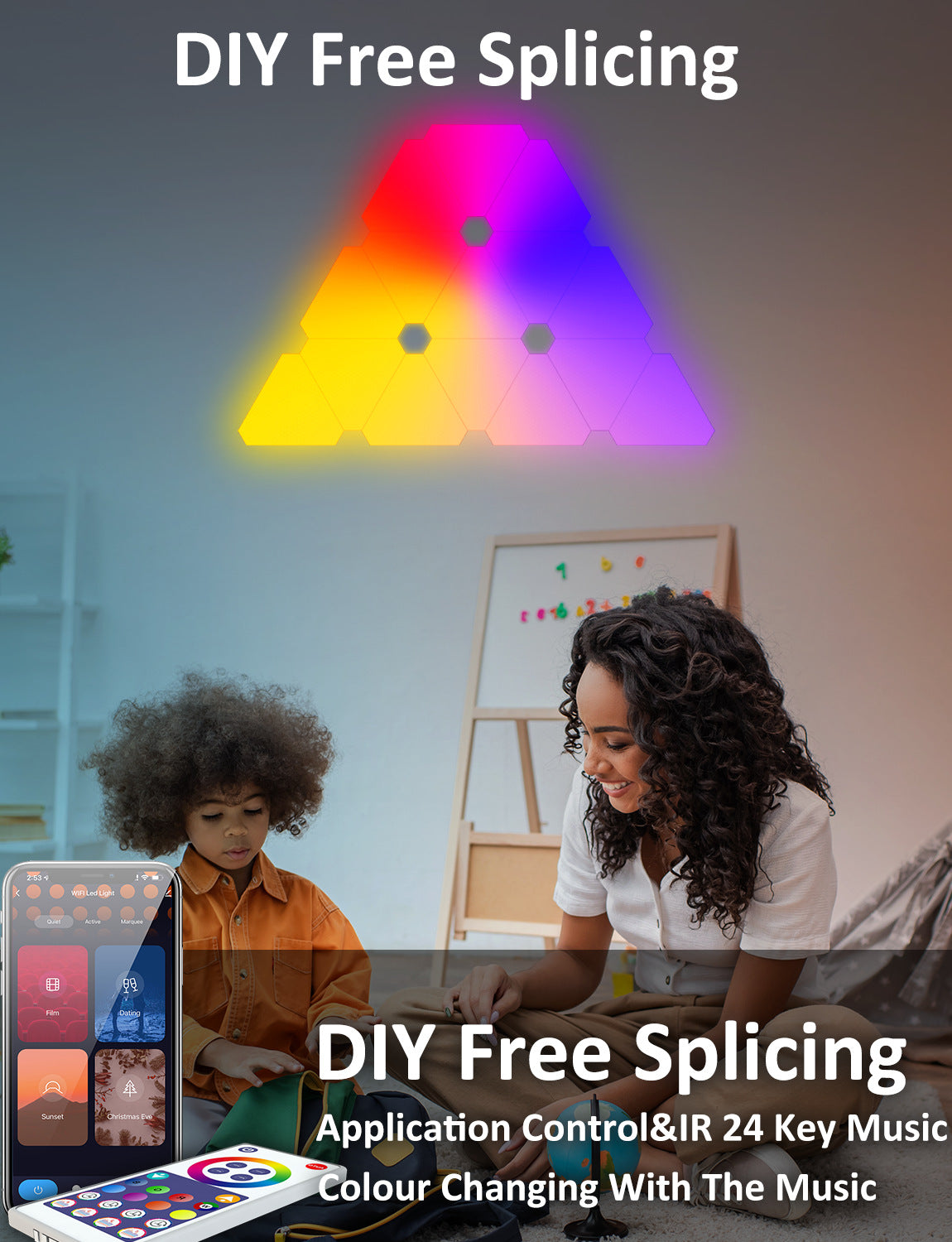 Revamp your gaming or entertainment setup with our Smart LED Triangle Lights. Unleash creativity by setting up these modular lights to create your own patterns. Sync them to any music or sound for real-time audiovisual spectacle. Perfectly suited for vibrant game nights, cozy evenings, or lively parties, these lights boost your decor while being energy efficient. No more manual adjustments; just use our user-friendly app to control settings from colorful intensity to effect speeds from the palm of your hand. Installation is simple, and you can extend patterns as much as you please for that ultimate tailored ambiance.