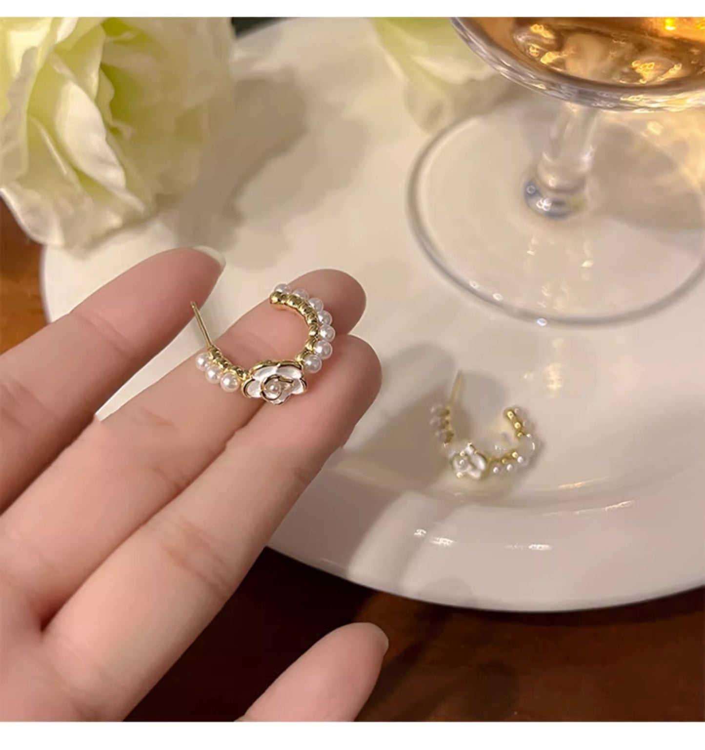 • Elevate your style with these chic camellia pearl earrings designed to catch attention wherever you go.