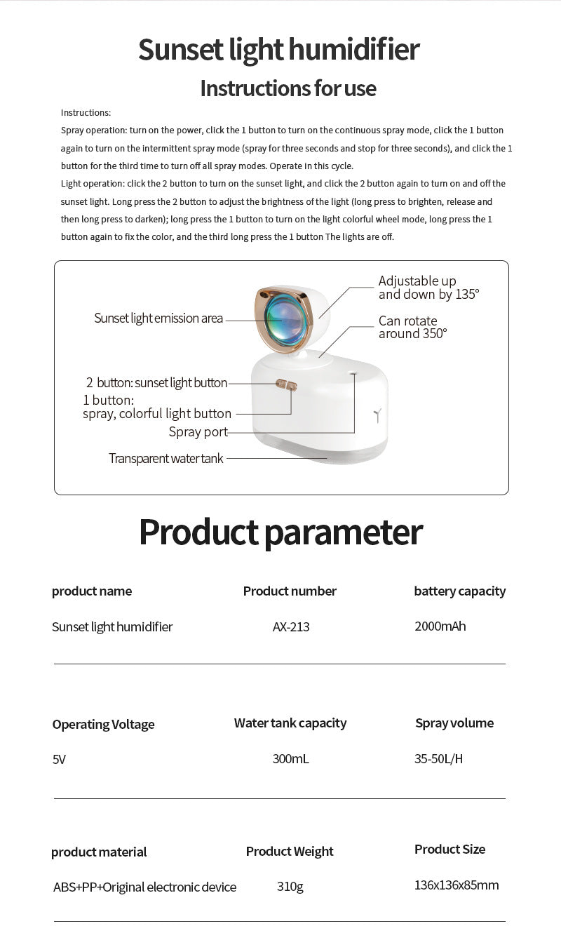 • Stylish Sunset Lamp Design combines ambiance lighting and humidification in one.