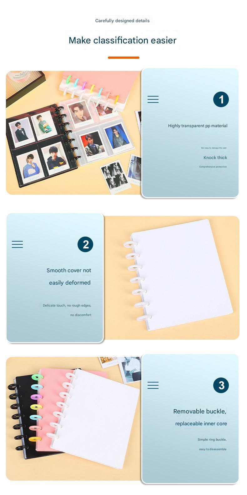 Organize your cherished memories and collectibles with elegance and ease using our Multi-Pocket Photo Album. This A4-sized album is equipped with a durable PP cover that is not only tough but also lightweight. The interior features a smart four-grid layout per page, accommodating up to 80 or 120 slots depending on the page count you choose (20 or 30 pages). Available in a variety of colors including classic black, crisp white, lovely pink, and modern transparent, this ring binder album offers both functionality and style. Additionally, this album's versatile design offers customization with the ability to add more pages over time. Whether for personal collections, scrapbooking adventures, or as a thoughtful business gift, this photo album is designed to meet diverse needs and preferences.
